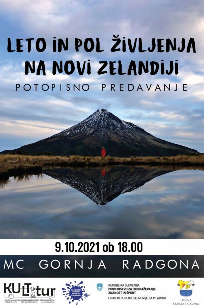Prijazno vabljeni na potopisno predavanje Leto in pol življenja na Novi Zelandiji, ki bo v soboto, 9. oktobra 2021, ob 18. uri v Mladinskem centru Gornja Radgona.
