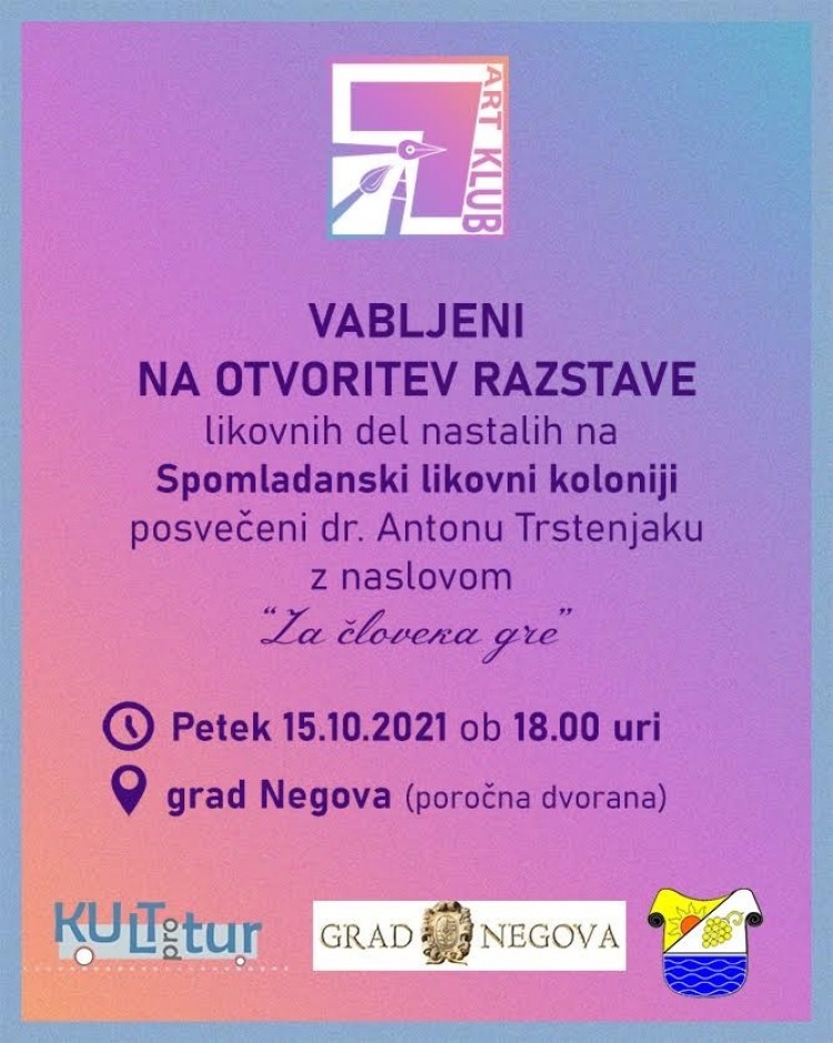 Vabljeni na otvoritev razstave likovnih del, nastalih na Spomladanski likovni koloniji, posvečeni dr. Antonu Trstenjaku, z naslovom "Za človeka gre", ki bo v petek, 15. oktobra 2021 ob 18. uri v poročni dvorani gradu Negova.
