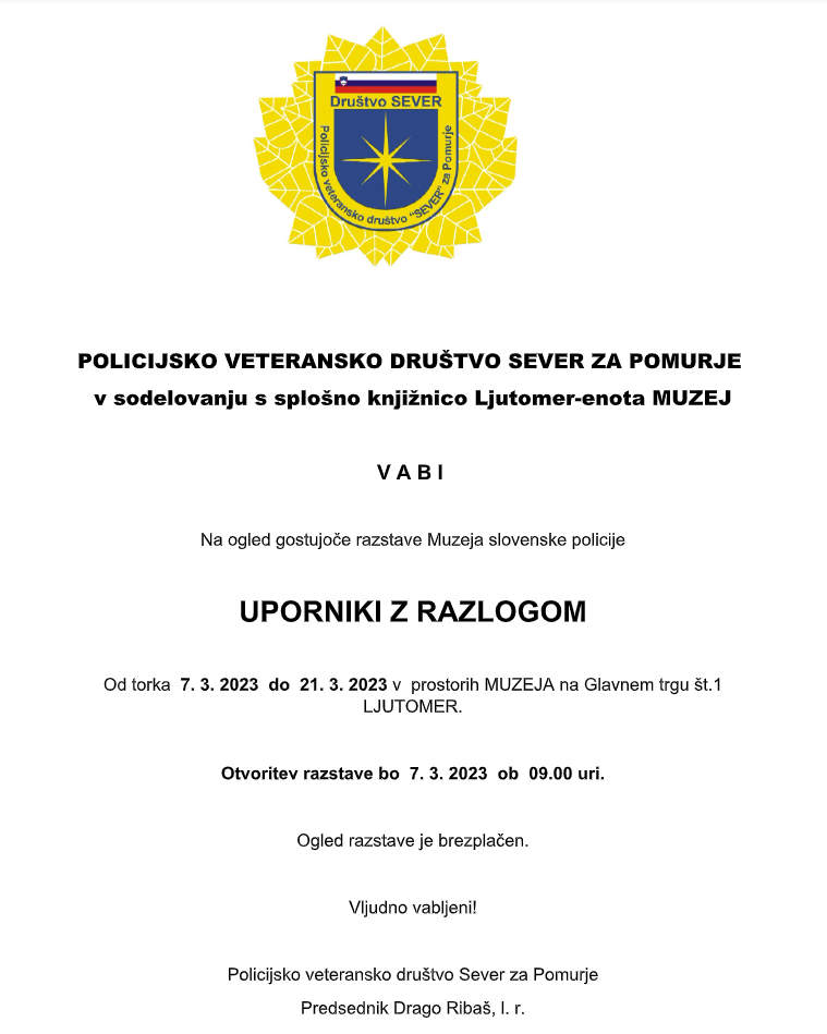 POLICIJSKO VETERANSKO DRUŠTVO SEVER ZA POMURJE v sodelovanju s splošno knjižnico Ljutomer-enota MUZEJ VABI Na ogled gostujoče razstave Muzeja slovenske policije