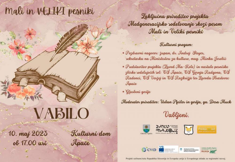 Ob zaključku projekta Medgeneracijsko sodelovanje skozi pesem – Mali in Veliki pesniki, vas vljudno vabimo na zaključno prireditev, ki bo dne 10. maja 2023 ob 17.00 uri v Kulturnem domu Apače.