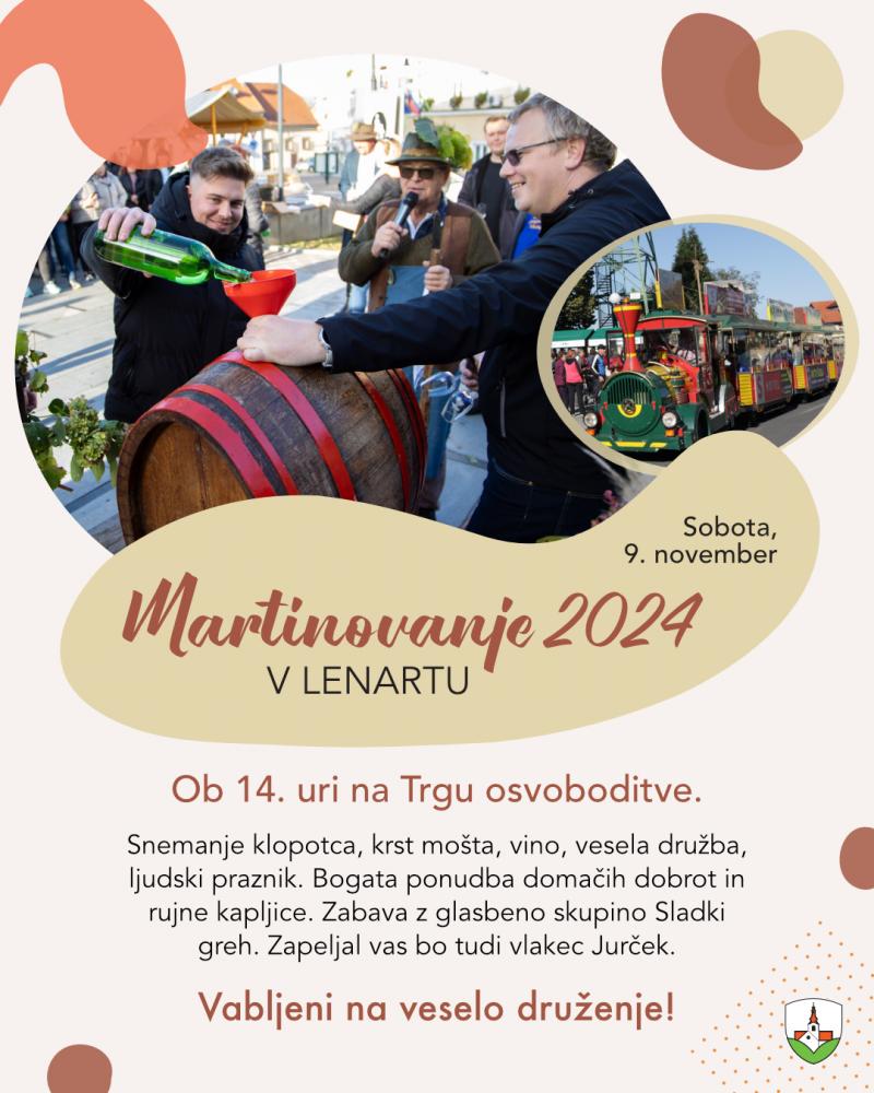 Snemanje klopotca, krst mošta, vino, vesela družba, ljudski praznik. «Vino ni rado samo,« pravi slovenskih pregovor, zato pridite, da boste delali družbo rujni kapljici, prijateljem in »Martinovim družabnikom«. Prikaz ljudskih šeg na Martinovo, Samo Tuš – Korl in zabava z ansamblom Sladki greh. Bogata ponudba domačih dobrot in rujne kapljice. Zapeljali se boste lahko tudi z vlakcem Jurčkom.