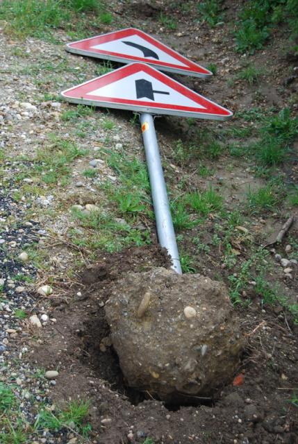 prometni znak, ki ni vzdržal naleta močnega vetra ali česa drugega, saj