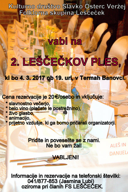 Kulturno društvo "Slavko Osterc Veržej" sekcija Folklorna skupina Leščeček, pripravlja za širšo javnost v soboto, 4.3.2017 ob 19. uri v Termah Banovci, 2. Leščečkov ples.
