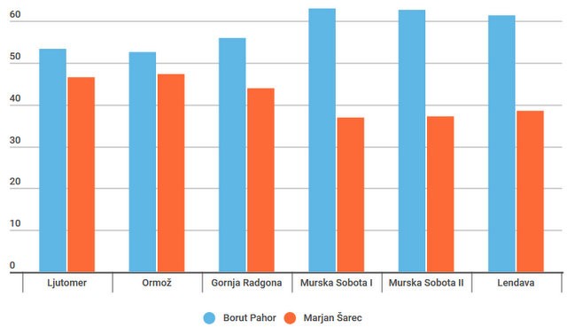 Borut Pahor je slavil v šestih volilnih enotah: najprepričljiveje je zmagal v Postojni, kjer ga je podprlo 63,08 odstotka volivcev. Sledijo volilne enote Ptuj (57,10 odstotka), Maribor (55,70 (odstotka), Celje (52,54 odstotka), Novo mesto (52,33 odstotka) in Ljubljana Center (51,54 odstotka). Marjan Šarec je slavil v dveh, Kranju (55,71 odstotka) in enoti Ljubljana Bežigrad (50,48 odstotka).