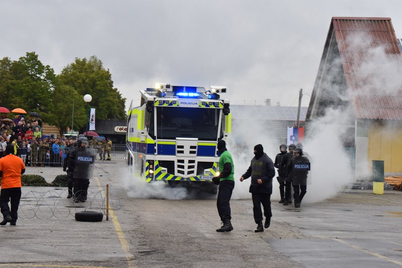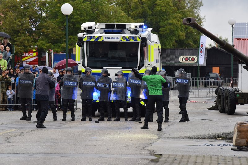Na sejmu SOBRA je Slovenska policija v soboto prikazala vajo, katere predpostavka je bila, da so izgredniki ogrožali varnost ljudi. Na srečo je tu posebna policijska enota, ki je ob podpori specialnega vozila z vodnim topom izgrednike spravila v red.