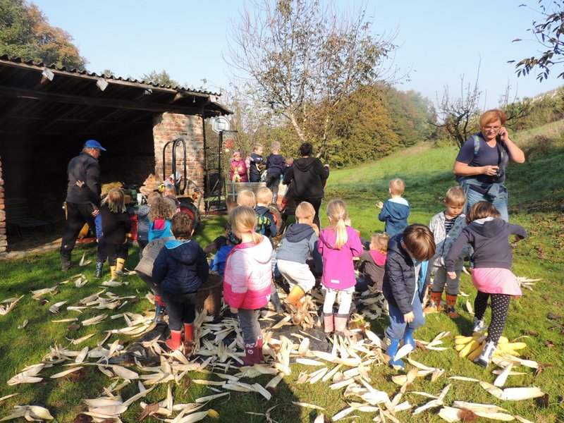 V starejši skupini otrok starih 4-6 let z vzgojiteljicama Matejko in Cvetko, iz vrtca Stročja vas, smo se letos odločili obuditi vse tiste stare običaje in dogajanja, ki so bila nekoč. Z dogajanjem v gozdu, kot so skrivalnice, lovljenje, plezanje, spuščanje po naravnem »toboganu«, guganje, smo se že seznanili. Tudi pravo prleško brotvo s prešanjem smo že imeli. Naslednji izziv je bil spravilo koruze.