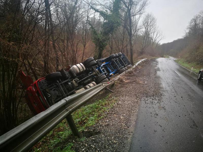 Prometna nesreča se je zgodila v ponedeljek, ko je 43-letni voznik tovornega vozila vozil iz smeri Mednarodnega mejnega prehoda Zavrč proti Ptuju. Izven naselja Dolane je vozil preblizu desnemu robu vozišča, zaradi tega zapeljal s ceste in se prevrnil na bok, na obrežje reke Drave. V nesreči ni bil nihče telesno poškodovan. Policisti so vozniku izdali plačilni nalog.
