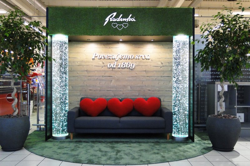 Vsi, ki dnevno kupujejo, obiskujejo, ali pa so to le naključni obiskovalci, lahko v Intersparu v Murski Soboti, v trgovskem centru BTC, od začetka letošnjega poletja, občudujejo ter se sproščajo v chill-out (pomiri se ali sprosti se) kotičku Radenska. Pred letošnjim poletjem so se namreč v družbi Radenska d.o.o. odločili, da svojim kupcem ponudijo idiličen chill-out kotiček za sprostitev. Mineralna voda Radenska namreč v letošnjem letu praznuje častitljivih 150 let, saj so prav leta 1869 napolnili prve glinene steklenice z mineralno vodo. V kotičku za počitek kupcem ponujajo udobno namestitev v udobni zofi ob chill-out glasbi z brbotanjem vodnih mehurčkov, ki kupca ob čudovitih vodnih valjih odpeljejo v vodne globine. Slogan letošnjega jubileja Radenske se glasi: Povezujemo srca od leta 1869. In prav od tega leta naprej je kupcem pripravljen še slikovni material, ki krasi zunanjost sprostilnega kotička in si ga lahko ogledajo. Notranji del izpostavitve je prodajno usmerjen. Krasi ga prodajni osemkotni stolp, ki upodablja Zdravilni vrelec iz Radencev s prepoznavnim simbolom na vrhu stolpa - puščico s tremi srci.