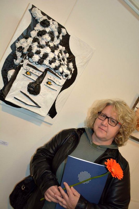Terezija Šegula je prepletala oblo in oglato kot organsko in anorgansko. Linorez Sreča je doma odslikava ljudsko ornamentiko in ročne spretnosti žena. Pogled skozi kovinsko kovano ograjo, prepredeno z metulji in ovijalkami je pomirjujoč. Slika Mehko in trdo Tamare Špitaler Škorić upodablja ujetost figure v globini slikarskega zaboja. V zavozlanem telesu čutimo moč in energijo, v oglatem okvirju pa obstojnost in trdnost. Diagonalna kompozicija v sliki Rože Bineta Šmona izžareva sončno energijo ter občutek toplote. Šablonski cvetni listi oziroma žarki so ostri in togi. Nekaj grotesknega je v črno-beli kaširani sliki Stražnik Edite Vodan Šoštarič in kipu Solzi, Dane Štrucelj. Medtem ko Stražnik izstopa iz slike s škatlastim obrazom, sta dejanski solzi na kipu komaj opazni. Teža glinenih obrazov, pritrjenih na oglati kovinski podstavek, je v nasprotju z lahko kaširano sliko. V asemblaž Time je Alina Timofeeva vkomponirala osončje, astrologijo, zvezdo, simbole planetov in kolesje. Prevladujoča rumena barva sili v ospredje, sliki pa daje napetost decentrirana kompozicija. En mož - orkester Lojzeta Veberiča učinkuje kot narisana skulptura. Poveden naslov pove vse; mož igra vse instrumente in lepo povzema temo letošnjega natečaja z oblimi in oglatimi linijami", je še dejala doc. Polona Maher, akad. kiparka in prof. lik. umet.