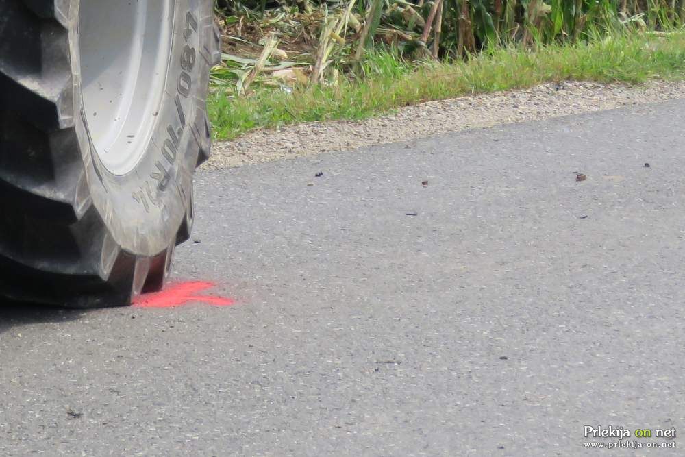 Iz PU Maribor so sporočili, da je v četrtek, 22. oktobra, 72-letni moški na njivi v naselju Dolič s kombajnom spravljal koruzo. Okoli 13. ure je z delovnim strojem-kombajnom zapeljal vzvratno, pravokotno proti vozišču lokalne ceste Levanjci - Dolič, z namenom da poravna kombajn za pričetek žetve nove vrste. Med vzvratno vožnjo je z zadnjim delom kombajna trčil v 66-letnega pešca, ki je stal ob desnem robu vozišča in se pogovarjal z 72-letno voznico osebnega avtomobila, ki je sedela v vozilu in se je ustavila zgolj zato, da je pozdravila opisanega pešca. Voznik kombajna je pešca po trčenju, z zadnjim delom kombajna stisnil ob desni bok osebnega avtomobila, in ga z osebnim avtomobilom vred potisnil proti sredini vozišča. Pešec se je ob tem hudo telesno poškodoval in so ga z reševalnim vozilom prepeljali v SB Ptuj. Tam je nekaj po 16. uri, zaradi prehudih poškodb, umrl.