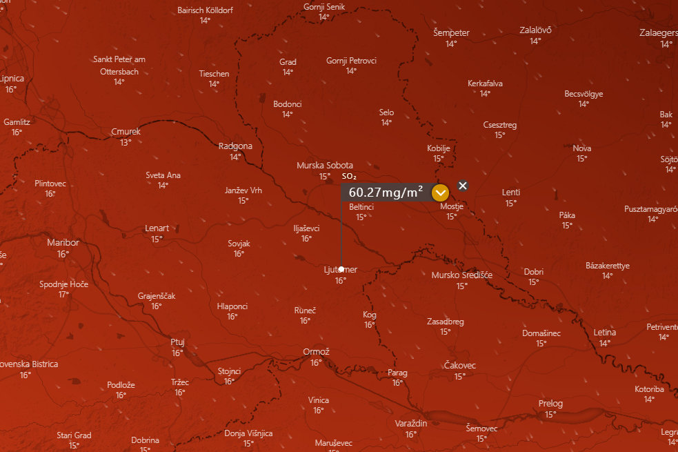 Oblak žveplovega dioksida pa v teh dneh vztrajno prodira tudi nad naše kraje. Povečana koncentracija se je iz Španije razširila v Francijo ter nad praktično celotno Nemčijo, Poljsko, Češko, Slovaško, Avstrijo, Madžarsko in tudi Slovenijo. V času pisanja tega članka koncentracija SO2 v severovzhodni Sloveniji presega 60 mg/m2 SO2 v ozračju. Podrobno gibanje lahko spremljate na spletni strani windy.com. Severno od nas te vrednosti že presegajo 230 mg/m2. Vrednosti se sicer pri nas iz ure v uro zmanjšujejo.