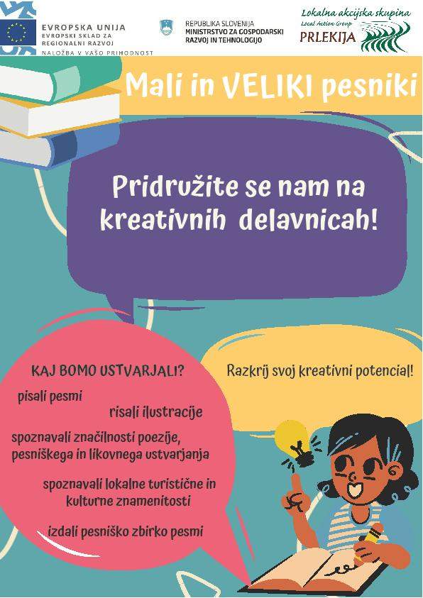 Na osnovnih šolah smo projektni partnerji izvedli kreativne in medgeneracijske delavnice z namenom, da otrokom približamo lokalne turistične in kulturne znamenitosti ter jih seznanimo s poezijo in pesniškim ustvarjanjem. Kot rezultat kreativnih in medgeneracijskih delavnic so otroci napisali pesmice v rimah na temo lokalnih turističnih in kulturnih znamenitosti območja LAS Prlekija. Pesmi so poleg otrok ustvarjale tudi njihove babice in dedki. Nastalo pesniško zbirko smo obogatili tudi z ilustracijami, ki so jih pripravili varovanci Socialno varstvenega zavoda Hrastovec, enote Apače in osnovnošolski ter vrtčevski otroci iz sodelujočih šol.