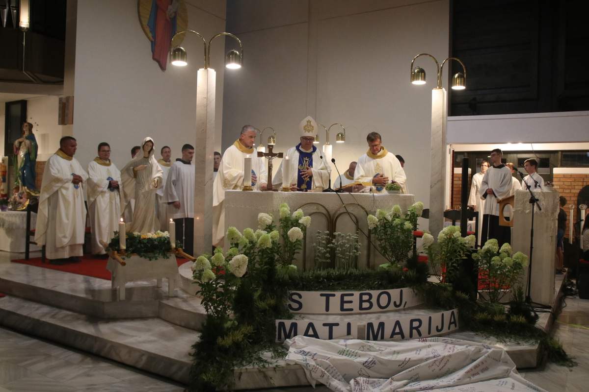 Ob 18.00 smo začeli z molitvijo rožnega venca in molitvijo k sv. Duhu. Slovesno sv. mašo je vodil soboški škof msgr. dr. Peter Štumpf ob prisotnosti duhovnikov s celotne Slovenije, ki so na dogodek prišli z mladimi iz svojih župnij. Pred oltar smo prinesli zahvale, prošnje in molitve ter jih predali Bogu v naročje. Po prejetem blagoslovu smo zapeli Salve Regina, prižgali svečke in zapeli litanije Matere Božje.