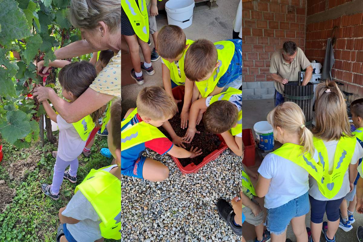 Tako smo se odpravili na pravo »brotev« na Turjanskem Vrhu, družine Cvetke in Andreja Marinič. Naša upokojena vzgojiteljica Cvetka nam je z možem Andrejem omogočila praktično delo in prikaz prave »brotve« in »prešaja« kot se je izvajalo nekoč. Otroci so marljivo trgali, prešali in na koncu poskusili odličen grozdni sok (smo jim rekli kar mošt). Seveda ni manjkalo tudi prave malice, katero je spekla naša prijazna gostiteljica. Začinili smo jo pa s pesmijo »jaz v gorice grem« katero nam je zapel sam g. Andrej. Bil je res lep in nepozaben dan.