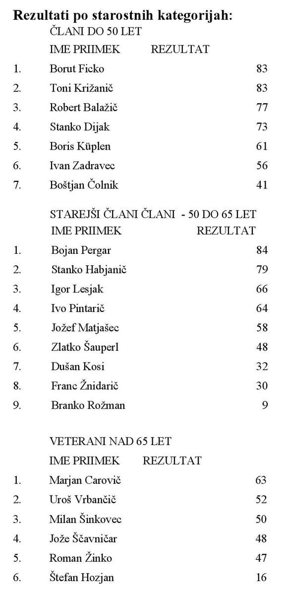 Pri članih do 50 let je slavil Borut Ficko (83 krogov), pri starejših članih - 50 do 65 let Bojan Pergar (84 krogov), pri veteranih - nad 65 let pa Marjan Carovič (63 krogov)