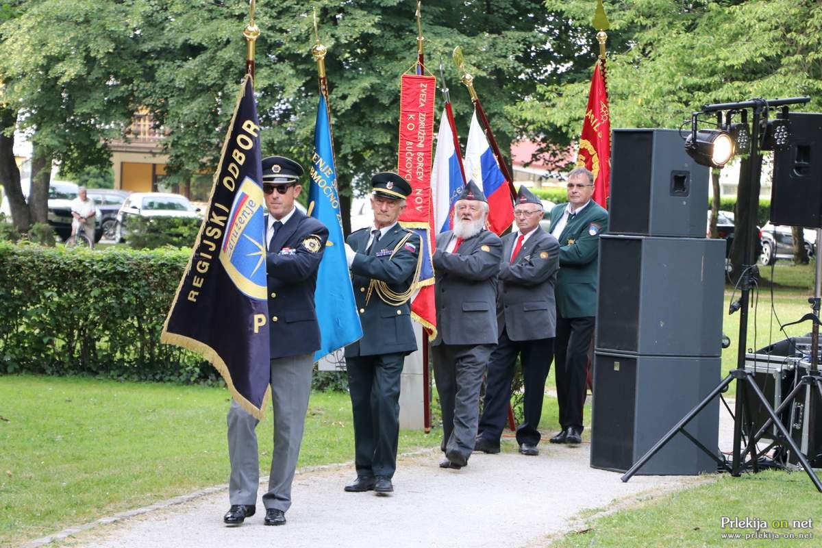 Minister Jevšek je svoj govor pričel z besedami slovenskega pesnika, partizana in narodnega heroja Karla Destovnika - Kajuha, čigar leto obeležujemo letos: "Nocoj je velik večer. V vseh mislih upornih je sladek nemir, pravičnosti slutim, ljubezni izvir ... Čas, ki bo prišel, je blizu nocoj!" "Bil je borec za svobodo, ki je želel in slutil za Slovence in Slovenke boljše čase. Tudi pred 32. leti je bil velik večer, ko smo na Trgu republike v Ljubljani prvič slovesno dvignili novo slovensko zastavo in je tedanji predsednik predsedstva Republike Slovenije, Milan Kučan, razglasil samostojnost Republike Slovenije, tedanji ljubljanski nadškof in slovenski metropolit, dr. Alojzij Šuštar, pa je blagoslovil lipo, kot simbol slovenstva. Verjamem, da se spomnite tistega veselega, poletnega dne, polnega hrepenenj in pričakovanj, ko smo dobili svojo državo," je med drugim povedal Jevšek ter spomnil, da so pot do nje več stoletij tlakovali "naši predniki, ki so za to, da smo obstali kot narod in da imamo danes svojo državo, umirali na številnih frontah. Pesniki, pisatelji in politiki so v težkih družbenih in socialnih razmerah začeli uporabljati slovenski jezik. Borili so se za pravico Slovencev in zagovarjali politične programe."