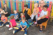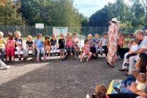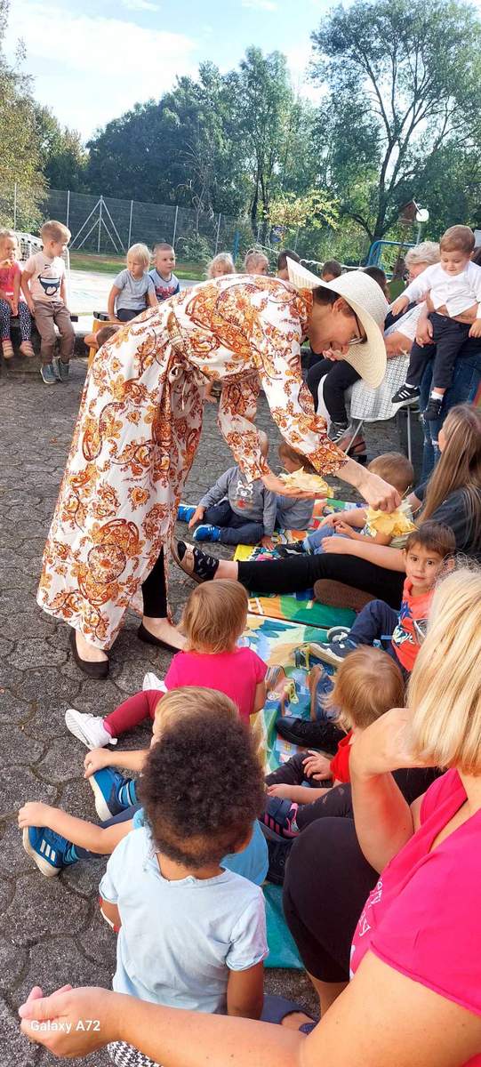 Otroci so na ploščadi vrtca z veseljem pričakali prav poseben obisk - tetko jesen, ki je s seboj prinesla veliko jesenskih plodov in jesensko obarvanih listkov. Predstavila nam je bogastvo jesenskih sadežev in zelenjave, ki so zrasli v gozdu, na njivi, v sadovnjaku in vinogradu in na vrtu. Otroci so jih večino prepoznali, težava so jim delali le ajda, pa kaka zdravilna rastlina, od zelenjave pa por.