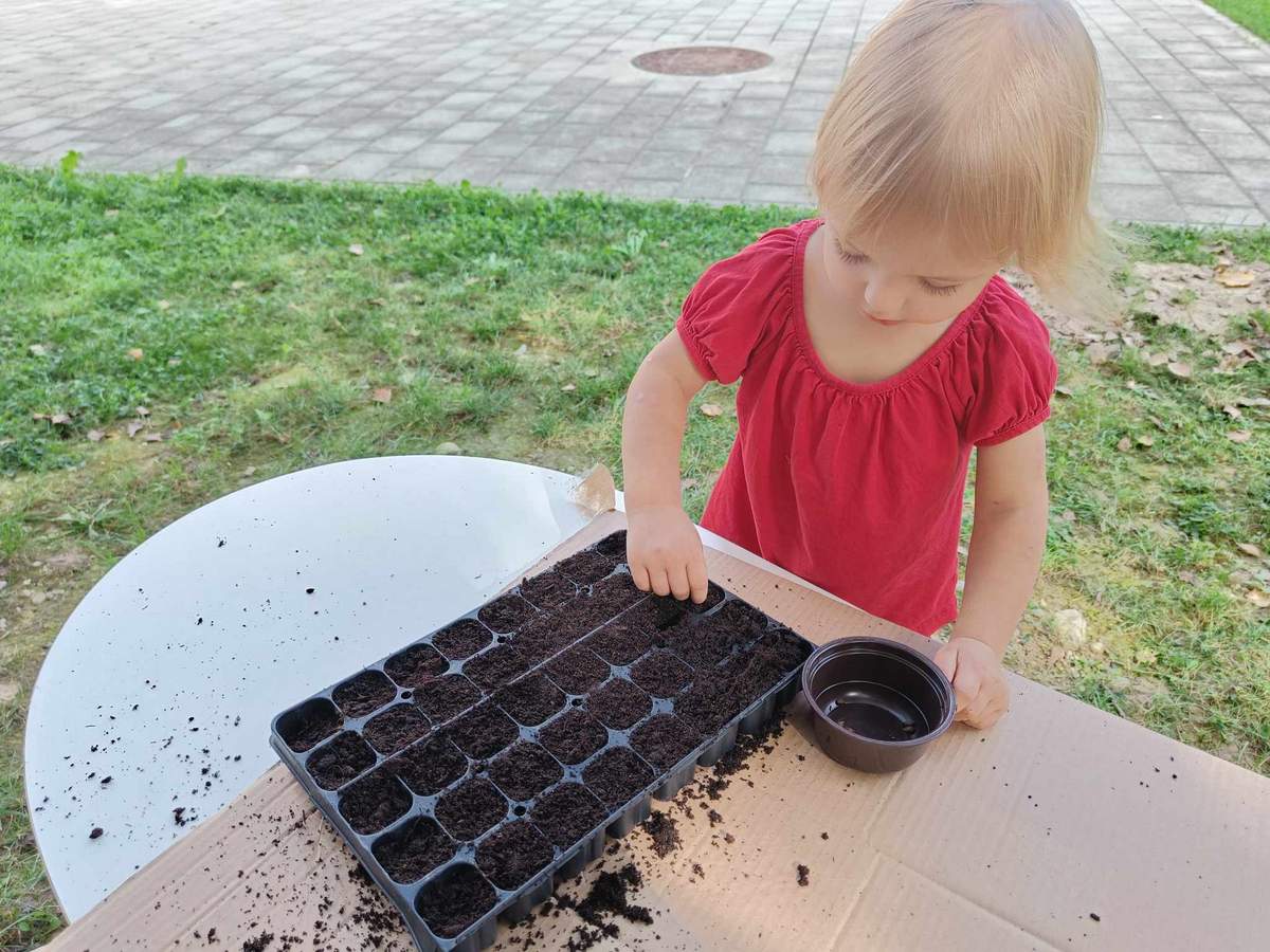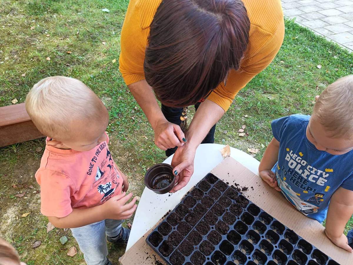 Za nas je tetka jesen imela pripravljeno prav posebno nalogo - obdarila nas je z veliko košaro slastnih jabolk, katerih pečke smo potem, ko smo jabolka pojedli, posejali v posebne lončke. Sedaj pa pridno čakamo, da bodo vzklile mlade rastlinice.
