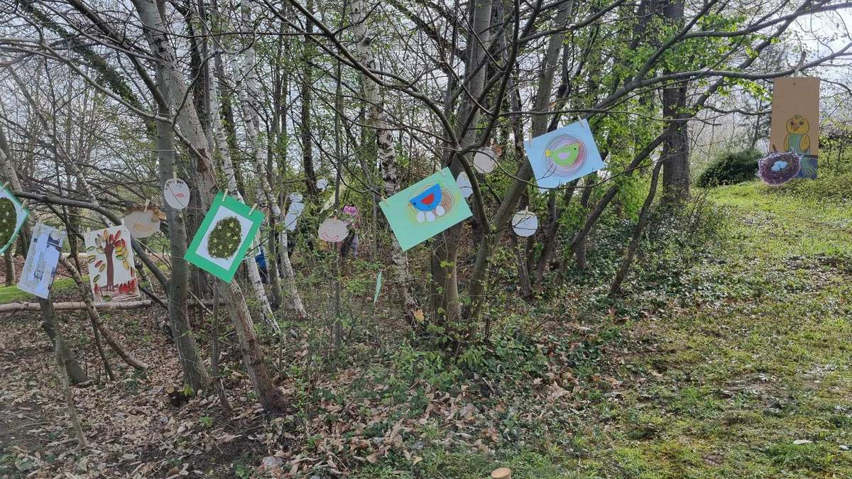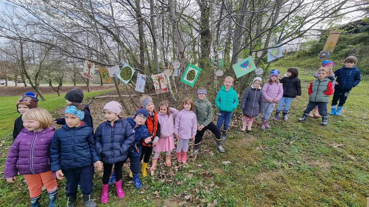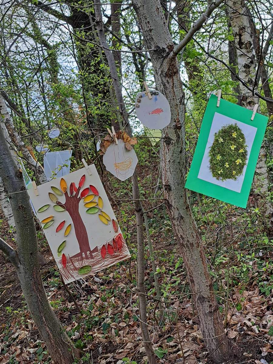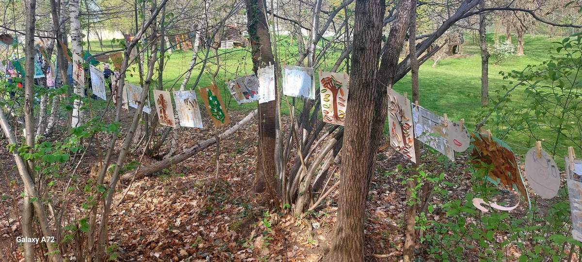 Prav vsak otrok iz vrtca je prispeval svoj likovni izdelek. Otroci z vzgojiteljicami so se sprehodili skozi gozdno igralnico in si razstavo ogledali. Bilo je zelo zanimivo in drugače, saj so otroci uživali ob ogledu, zvokih narave ter ob žgolenju ptičjega petja. Opazili pa smo tudi, da se pomlad prebuja tudi v naši gozdni igralnici.