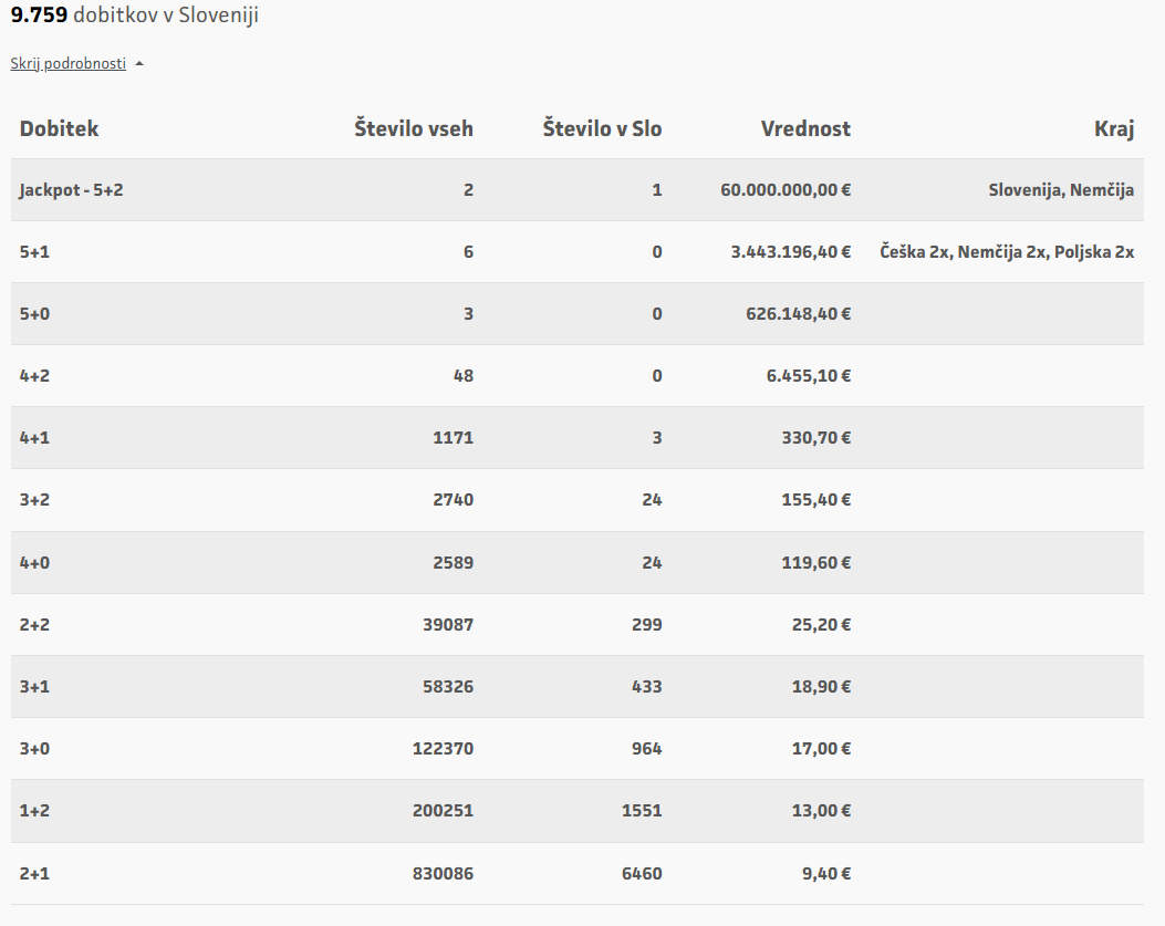 "Nekomu v Sloveniji so se uresničile sanje. Na loterija.si je bil vplačan jackpot v višini 60 milijonov evrov," so zapisali na Loteriji Slovenije, saj je po dvanajstih krogih brez glavne nagrade bil izplačan najvišji mogoči znesek na eurojackpotu, in sicer 120 milijonov evrov. Dobitek sta zadela dva, poleg v Sloveniji, je bil vplačan še v Nemčiji.