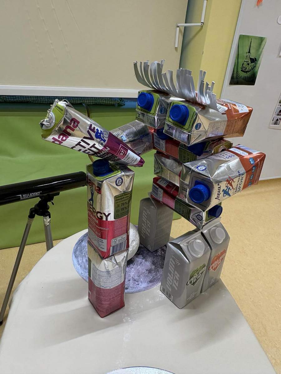 Po enem mesecu opazovanj in igre na temo luna smo z velikim veseljem pričakali naslednjo polno luno in lunin popoldan v vrtu. Na dan polne lune smo ostali v vrtcu do večera, si pripravili razne kotičke, opazovali smo zvezde na stropu naše igralnice, za hip smo se preoblekli in postali astronavti, ki gredo na luno, peli in plesali, na strop smo namestili lunine mene, da smo jih lahko opazovali in ustvarili svojega super junaka ZVEZDOGLEDA iz odpadnih tetrapakov.