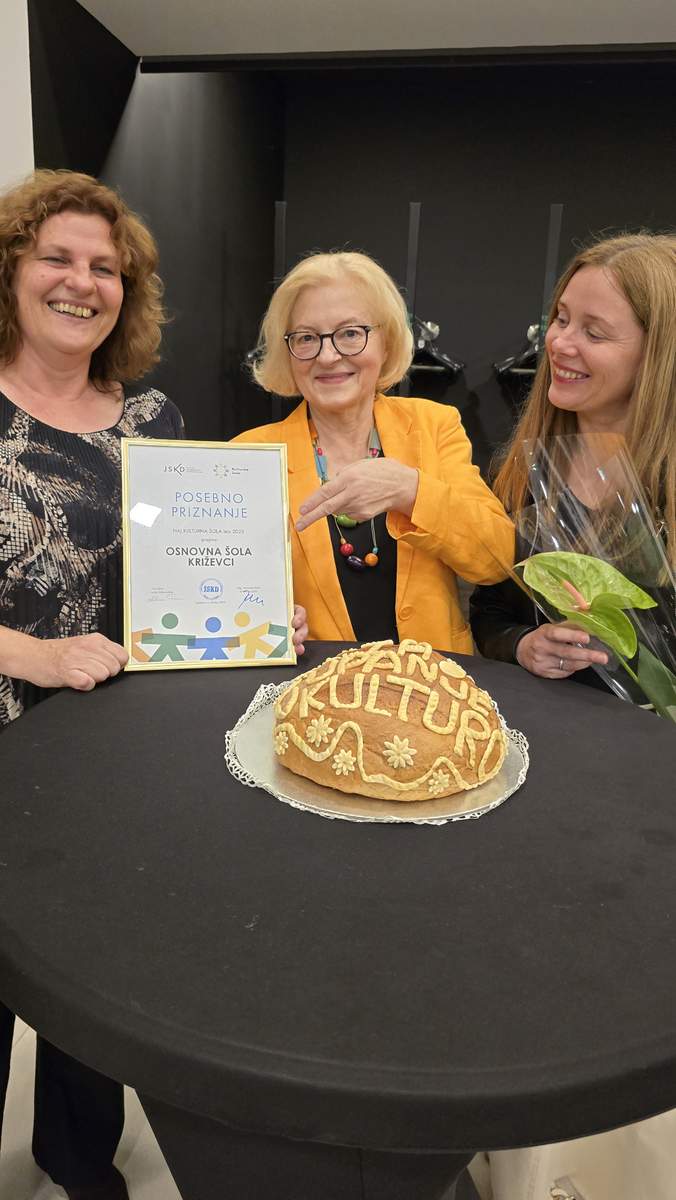 Osnovna šola Križevci je komisijo prepričala, ker je sodobna in učenju prijazna ustanova, ki jo obiskuje 289 učencev. Šola svoje poslanstvo gradi na spodbujanju odgovornosti, ustvarjalnosti in strpnosti ter na prepričanju, da kultura bogati vsakdanje življenje in povezuje skupnost. Učenci se redno udejstvujejo območnih, regijskih in državnih kulturnih srečanjih ter tekmovanj, kjer dosegajo odlične rezultate. Pester nabor dejavnosti sega od literarnega in likovnega ustvarjanja do raziskovanja kulturne dediščine, še posebej pa se šola ponaša z izjemnimi uspehi svojih pevskih zborov. Mladinski pevski zbor LA TI DO s kakovostnimi nastopi redno zastopa šolo na najširši ravni ter posega po najvišjih priznanjih. Pomembno vlogo imajo tudi projekti, kot je Noč branja, ki združujejo učence vseh starosti, spodbujajo bralno kulturo ter povezujejo šolo z domačim in mednarodnim okoljem. OŠ Križevci se dejavno vključuje v življenje kraja, sodeluje z lokalnimi društvi in kulturnimi ustanovami ter s prireditvami soustvarja kulturni utrip skupnosti.