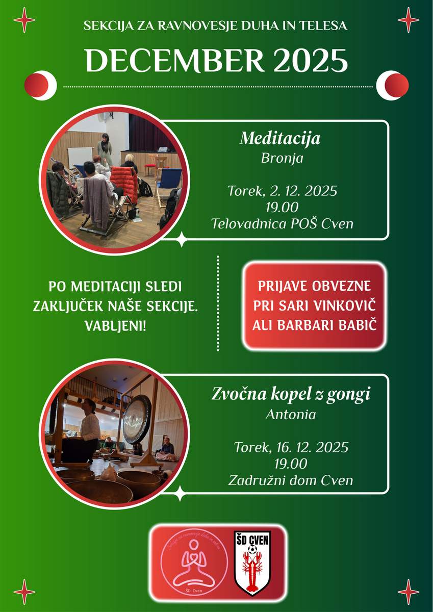 V začetku meseca je Sekcija za ravnovesje duha in telesa ŠD Cven pripravila še zadnjo letošnjo meditacijo z Bronjo, za čim bolj miren vstop v praznični čas.