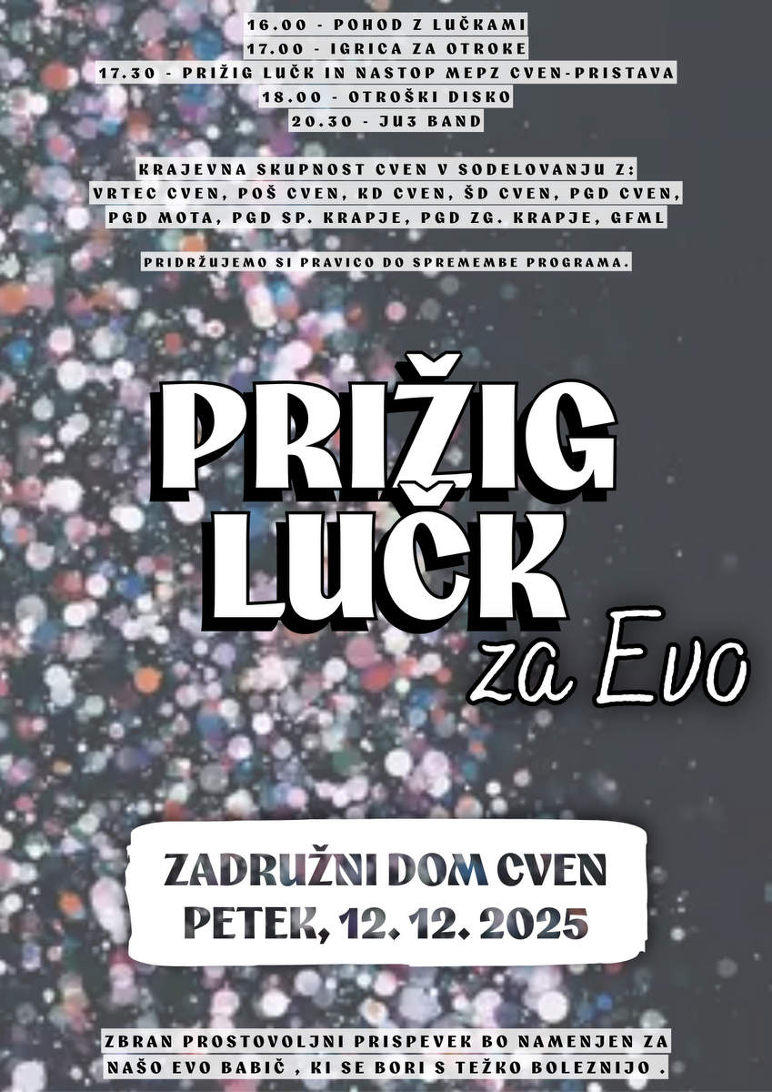 Dogajanje se bo začelo ob 16. uri s pohodom z lučkami, ki ga pripravlja vrtec Cven. Sledila bo igrica za otroke v izvedbi Kulturnega društva Cven. Pred zadružnim domom bomo prisluhnili Mešanemu pevskemu zboru Cven–Pristava in skupaj prižgali lučke. Nadaljevali bomo z otroškim diskom, dogodek pa bodo popestrili še mladi glasbeniki skupine Ju3 band iz Gimnazije Franca Miklošiča Ljutomer, sicer tudi Evini sošolci.