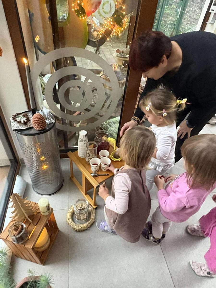 V petek, 5. decembra 2025, so otroci in vzgojiteljice skupine v vrtec povabili sodelavke, otroke iz drugih skupin, starše, stare starše ter sodelavce iz bližnje osnovne šole. Čajanka je svoja vrata odprla že ob jutranjem prihajanju otrok in povabila na posebno adventno druženje, ki je avlo vrtca napolnilo z nežnimi zeliščnimi vonjavami, toplino in pristnim občutkom povezanosti.