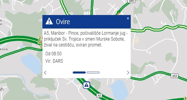 V smeri proti Murski Soboti žival na cestišču ovira promet na odseku Maribor – Pince, in sicer med počivališčem Lormanje jug in priključkom Sv. Trojica. Vozniki naj bodo na tem delu še posebej previdni in prilagodijo hitrost.