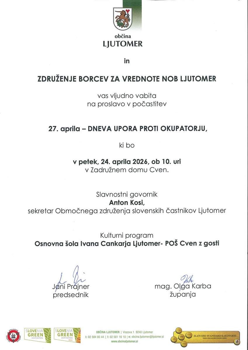Proslava bo potekala v petek, 24. aprila 2026, ob 10. uri v Zadružnem domu Cven.