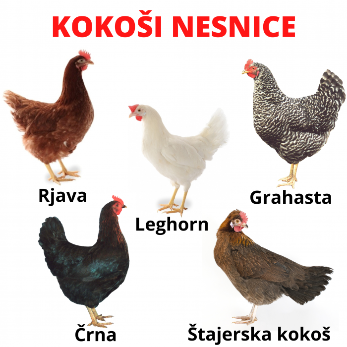 Kokoši nesnice - rjave, leghorn bele, grahaste, črne in štajerske. Naše kokoši so zdrave, zaščitene proti osmim boleznim. Pripeljemo v vse večje kraje v Prlekiji in drugje. Kmetija Šraj, Poljčane.