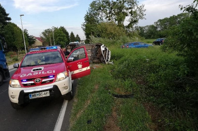 Pri trčenju osebno vozilo odbilo preko cestišča v obcestni jarek