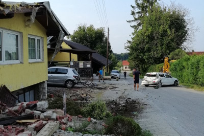 Bager zaradi tehnične napake trčil v trgovski objekt in dve vozili